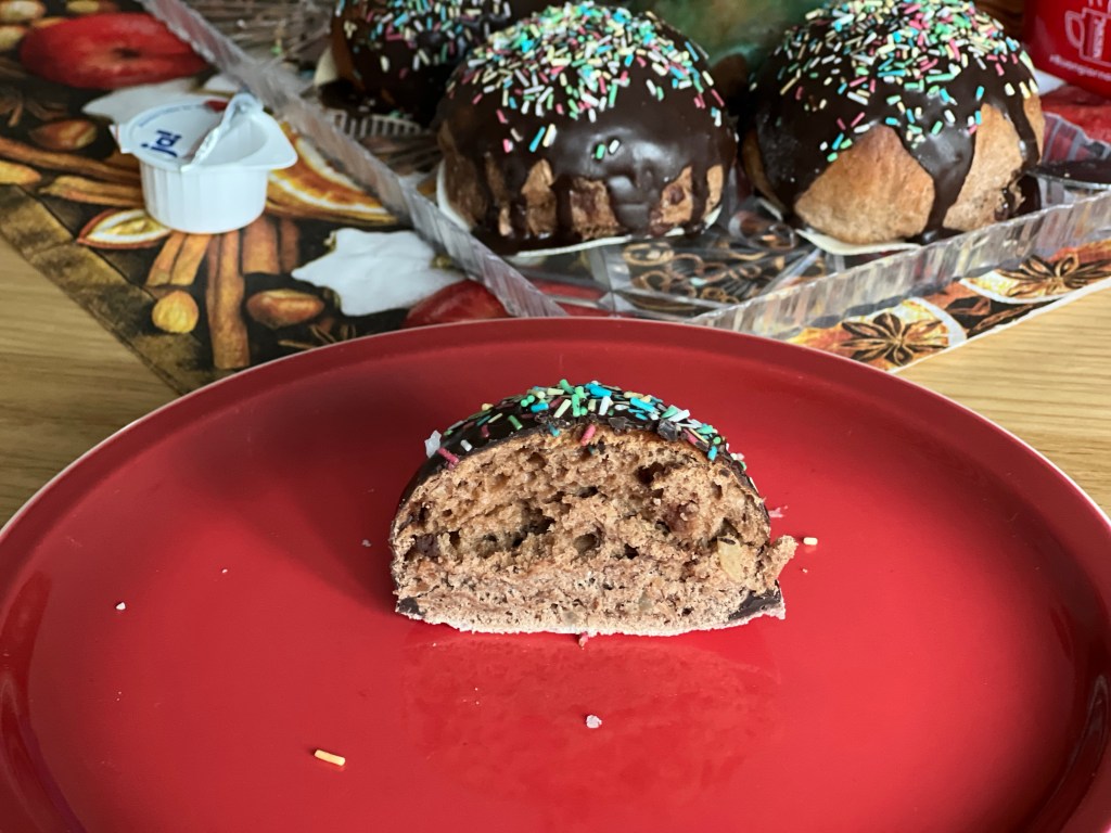 Auskühlen lassen und mit Schokoladenguss und Zuckerstreusel Dekorieren .