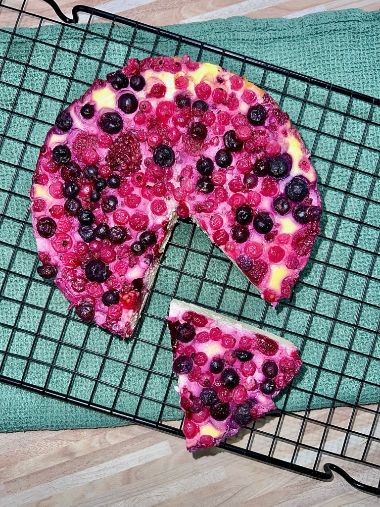 2. Beeren drauf verteilen und bei 190° Ober/Unterhitze für 40 min backen.