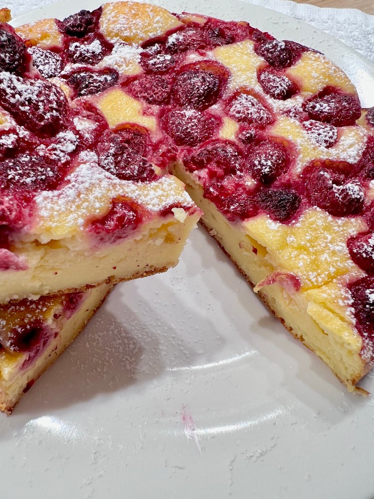 Alle Zutaten bis auf die Himbeeren miteinander vermengen . Den Teig in eine kleine Kuchenform geben und die Himbeeren drauf legen . Alles bei 180° Umluft für 30 min backen.