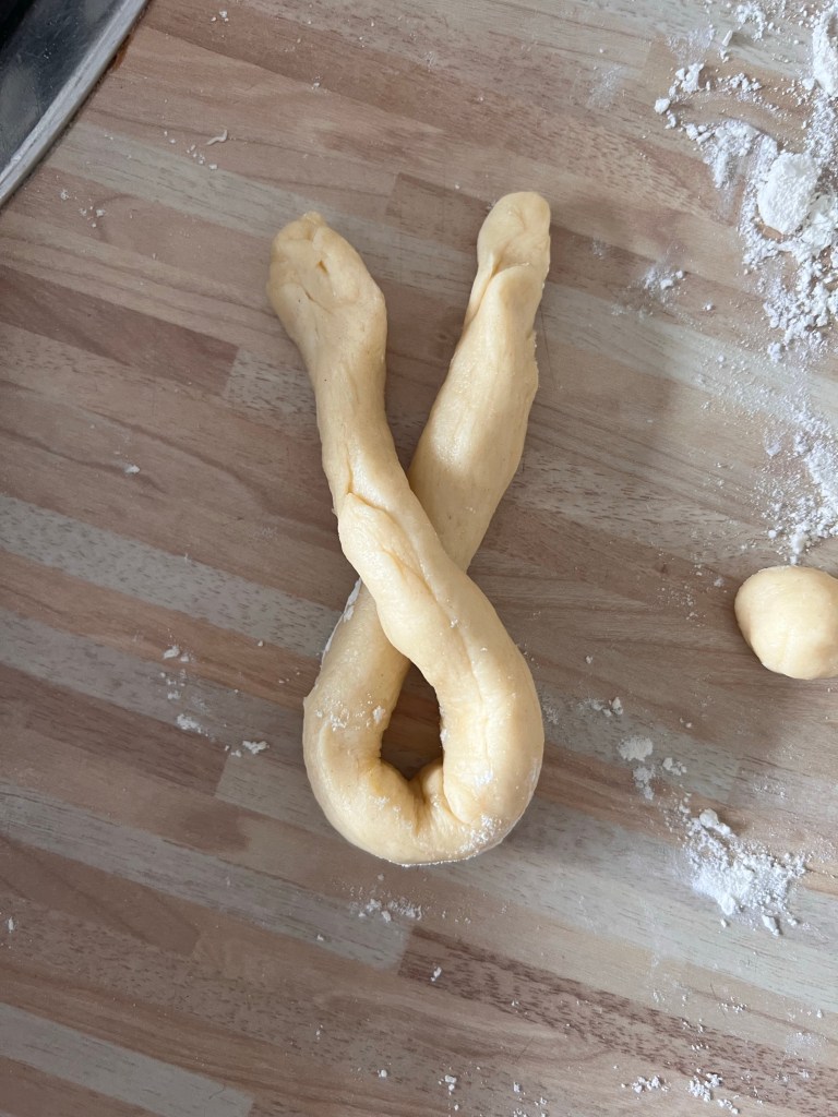 4. Teig in gleich große Stücke teilen ( ich habe hier immer 50g abgewogen) , zu strängen rollen und Formen.