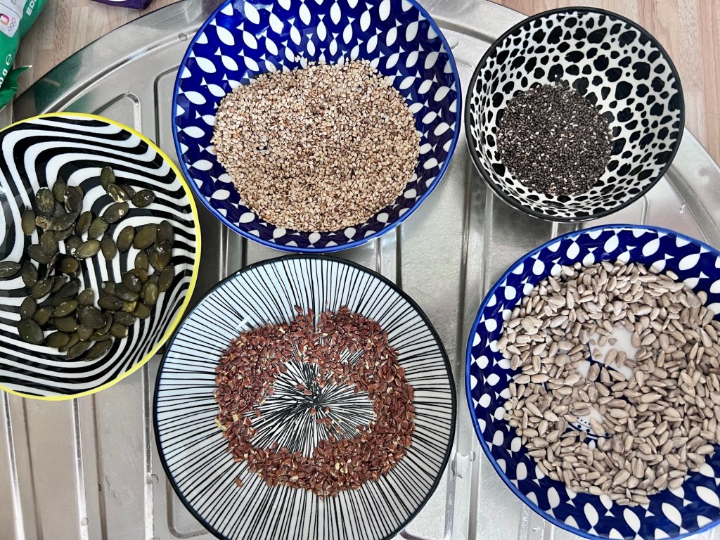 Jetzt rollst du jede Kugel nur noch durch die Körner etc. und legst sie auf ein mit Backpapier ausgelegtes Backblech und backst sie im vorgeheiztem Backofen bei 180 grad Umluft ca 20 Minuten bis sie Gold Braun sind.