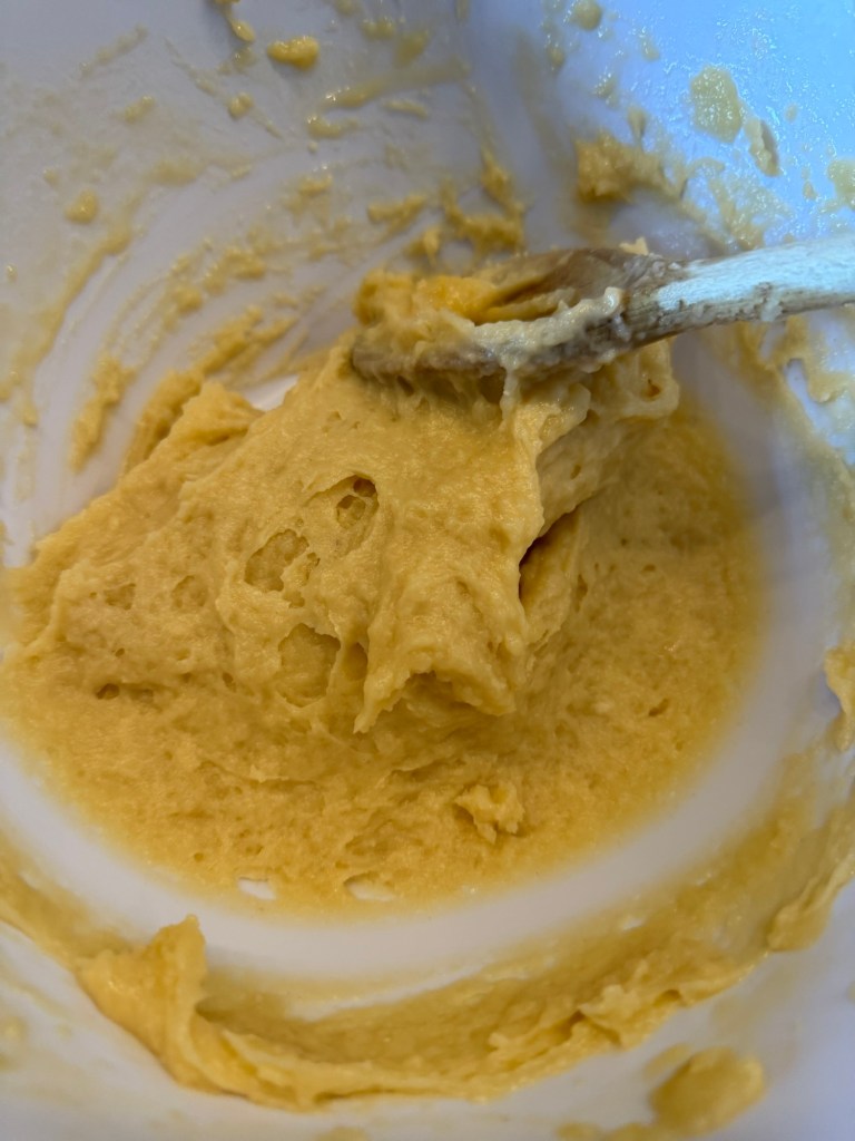Den Teig in eine andere Schüssel füllen und 3 Eier zufügen und gut mit einem Kochlöffel unterheben bis ein Homogener Teig entsteht . Das braucht ein paar Minuten .